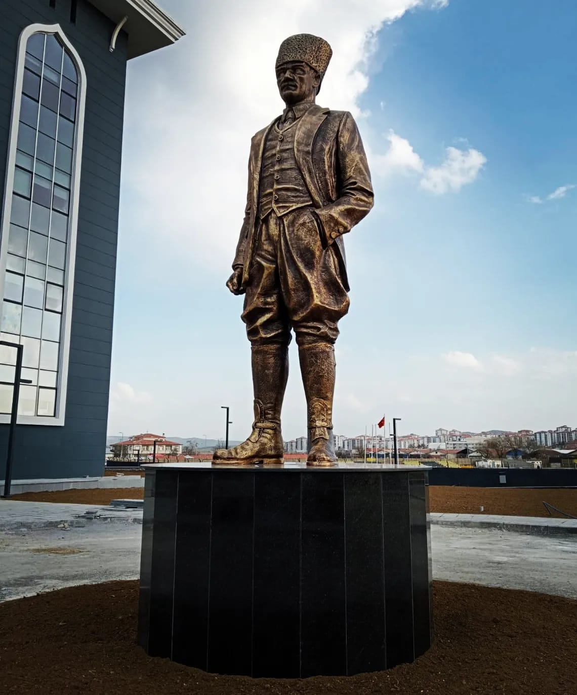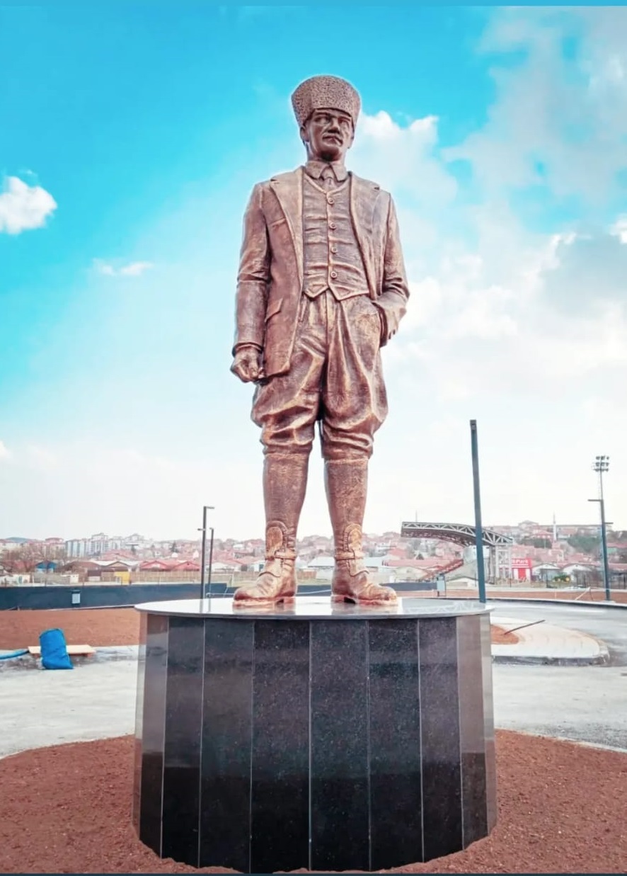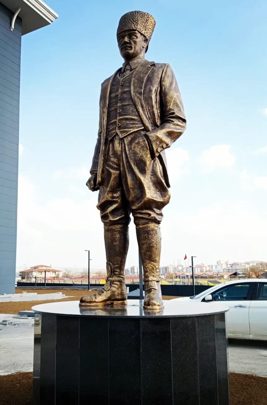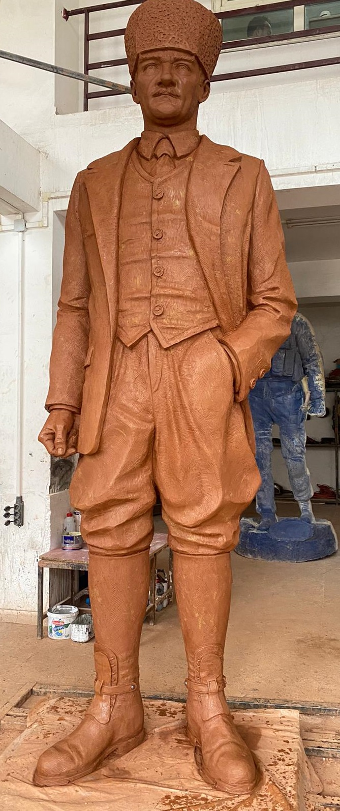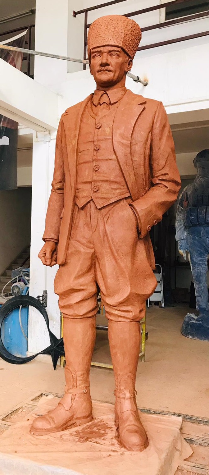 Ebatları 300cm olan kalpaklı Atatürk heykeli. Atölyemizde imal edilip çoğu belediyelere teslim edilmiştir.